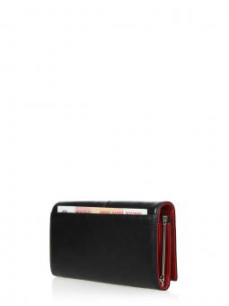 Внутри: три основных отделения для купюр, карман для купюр на молнии, двойное отделение для мелочи, закрывается на замочек-поцелуйчик, прозрачное окошко для проездного или фото, 8 кармашков для пластиковых и визитных карт .