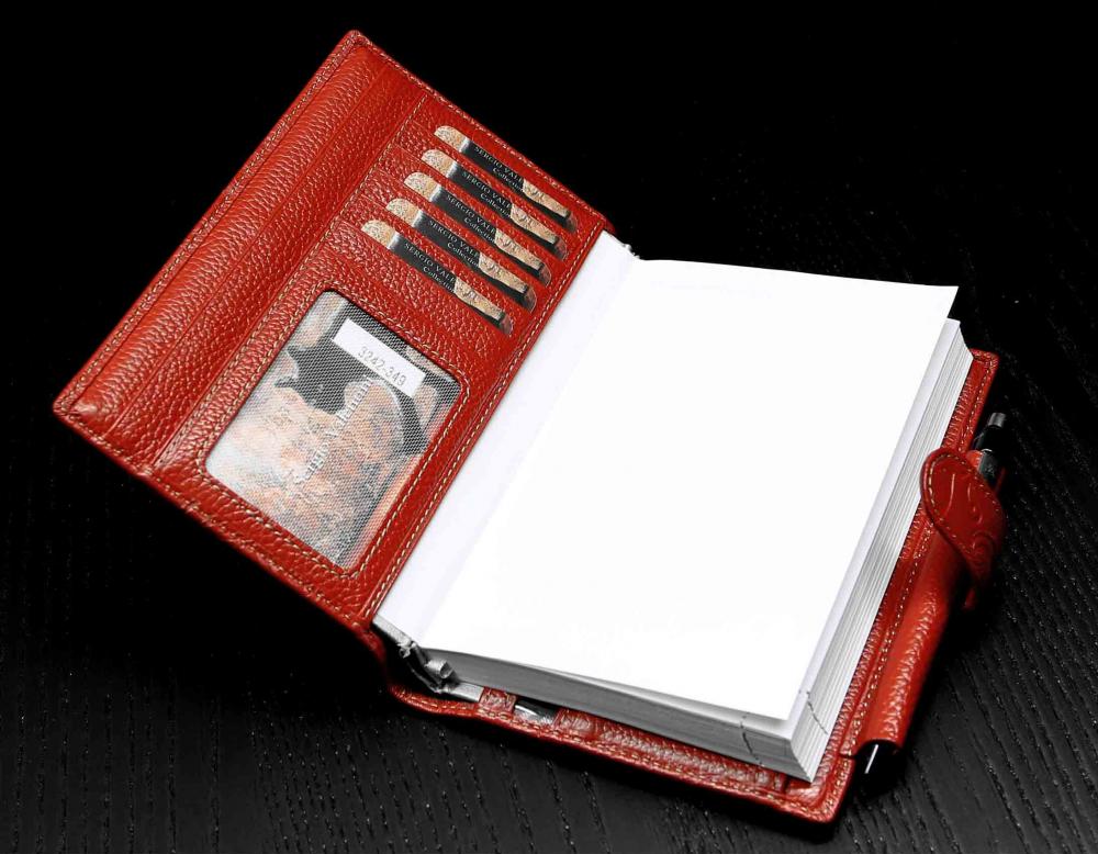 Внутри: прозрачный захват с одной стороны, отделение для бумаг и крепление для авторучки, с другой стороны расположены два отделения для бумаг или купюр, прозрачное окошко для проездного или фото, 5 кармашков для платиковых или визитных карт.