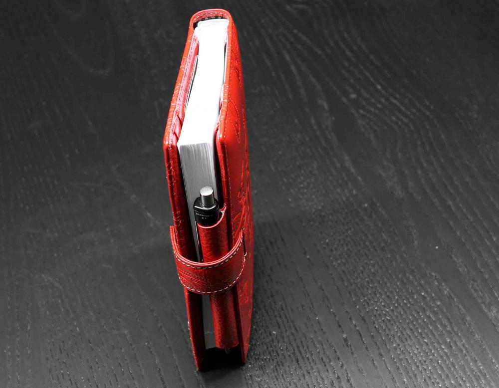 И ещё: закрывается перекидным хлястиком на кнопку. Фурнитура - белый металл. Авторучка в комплекте.