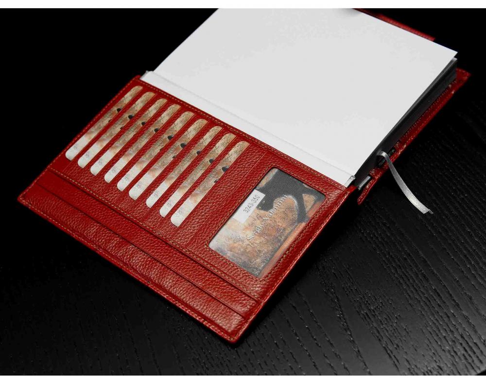 Внутри:  прозрачный захват с одной стороны, отделение для бумаг и крепление для авторучки, с другой стороны расположены два отделения для бумаг или купюр, прозрачное окошко для проездного или фото, 9 кармашков для платиковых или визитных карт.