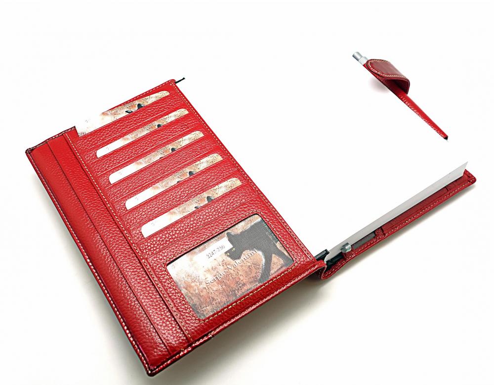 Внутри: прозрачный захват с одной стороны, отделение для бумаг и крепление для авторучки, с другой стороны расположены два отделения для бумаг или купюр, прозрачное окошко для проездного или фото, 9 кармашков для платиковых или визитных карт.
