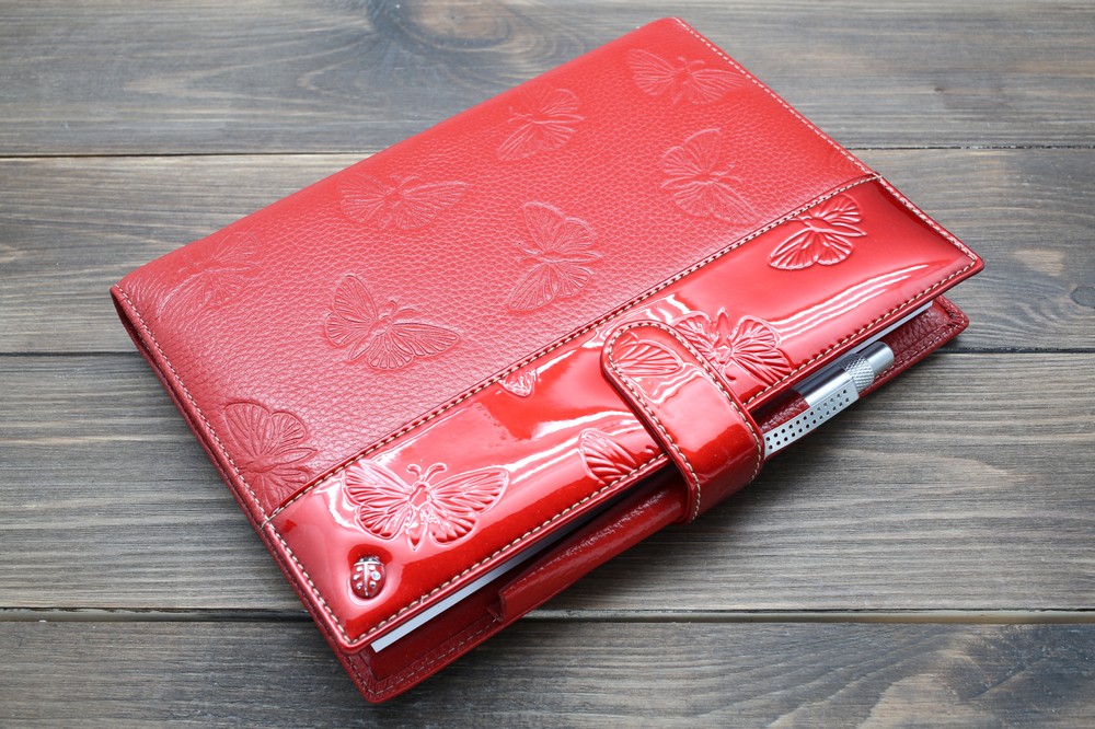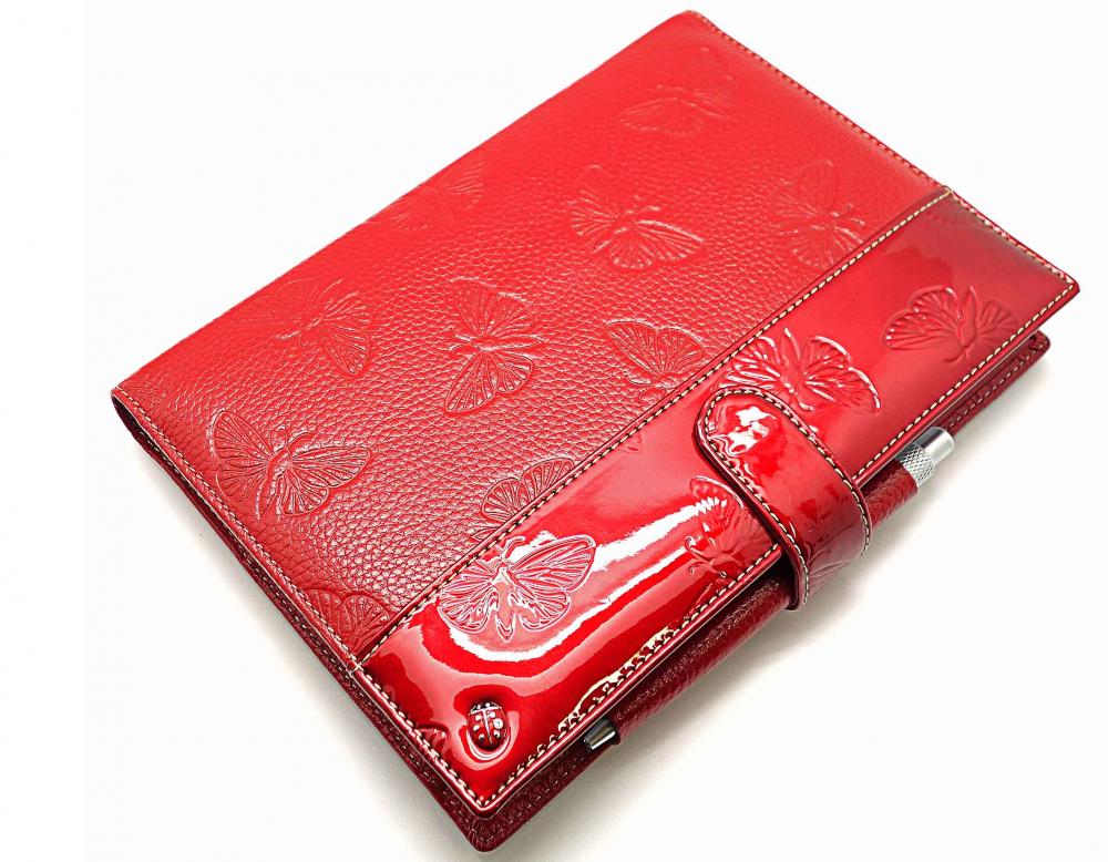 И ещё: закрывается перекидным хлястиком на кнопку. Фурнитура - белый металл. Авторучка в комплекте.