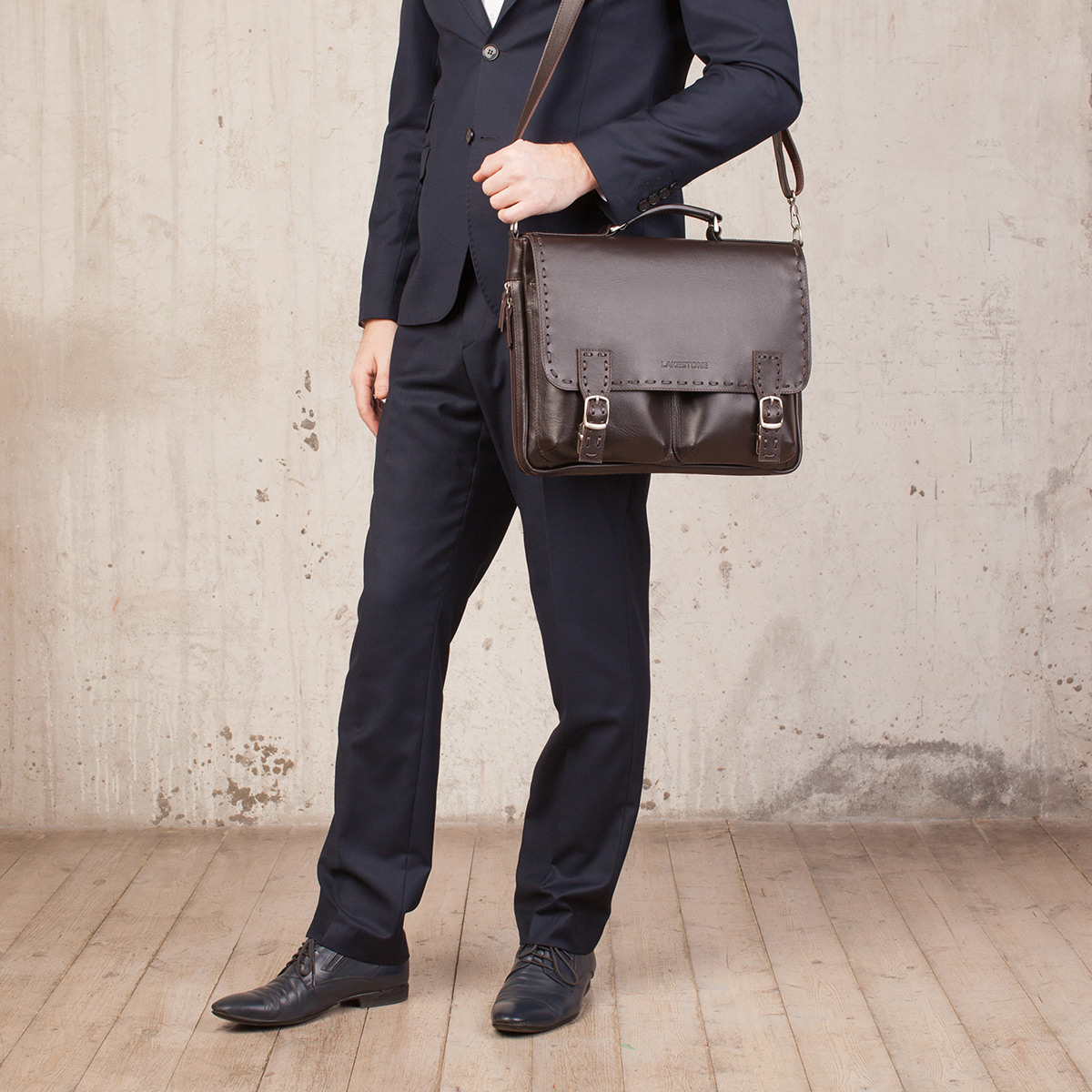 И ещё: портфель закрывается перекидным клапаном на фурнитуру, носится в руке. Хорошо держит форму. Вмещает в себя документы в формате А4, ноутбук до 14" дюймов. По периметру портфеля молния для увеличения внутреннего объёма. Дополнительно прилагается длинный регулируемый кожаный ремень на карабинах на или через плечо. Фурнитура - жёлтый металл.