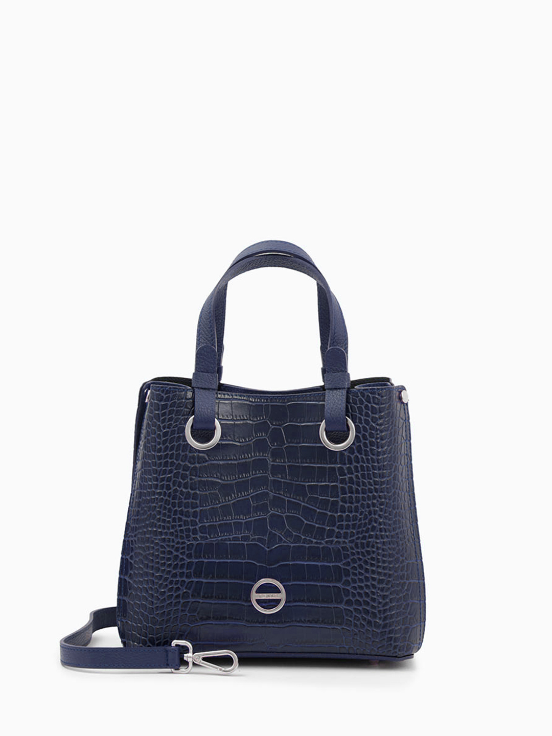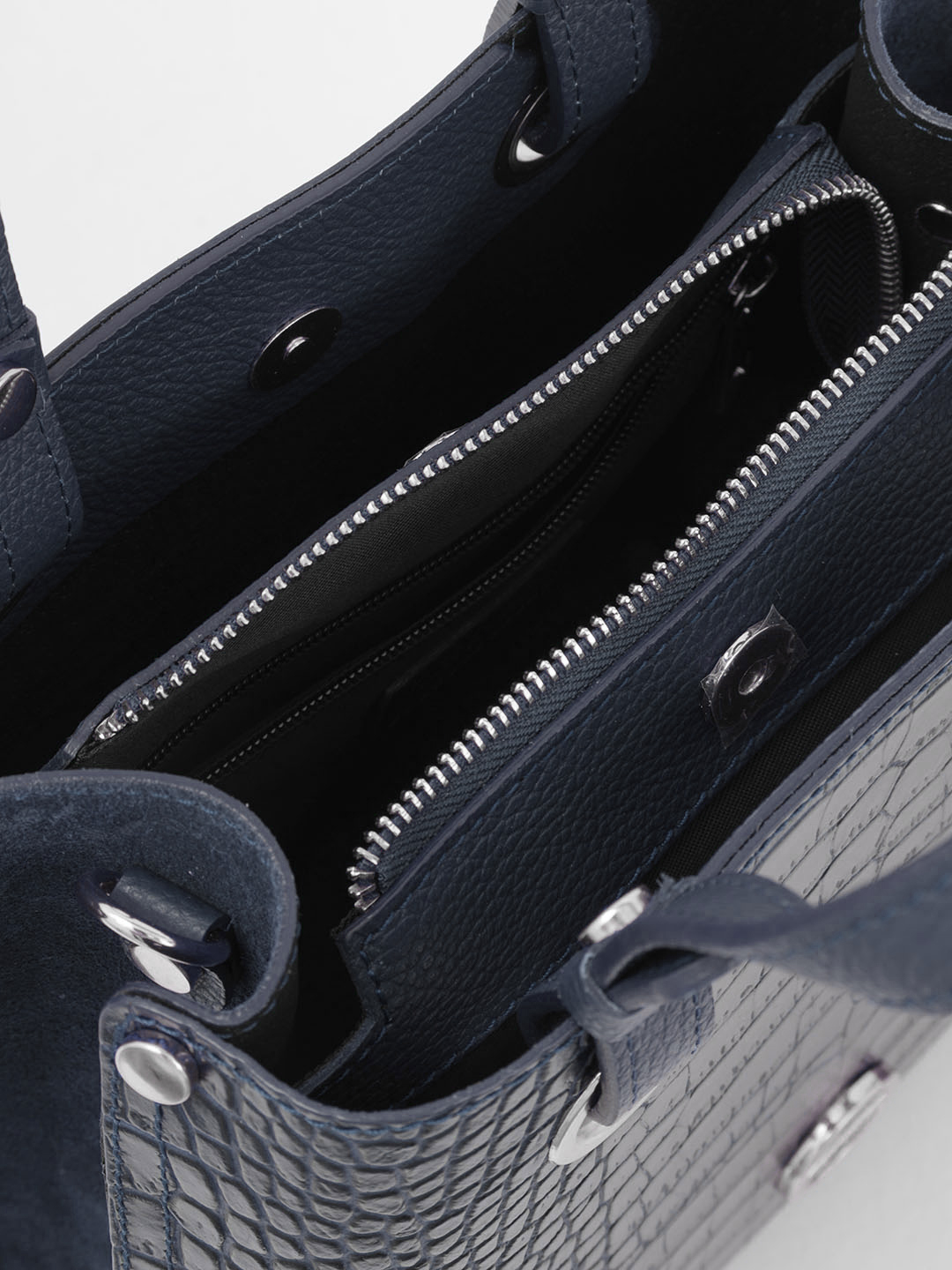 Внутри: три самостоятельных отдела. Центральный отдел закрывается на молнию, боковые - на магнитные кнопки. На задней стенке центрального отдела расположен карман на молнии, на противоположной стороне -  открытый кармашек для мобильного и мелочей.