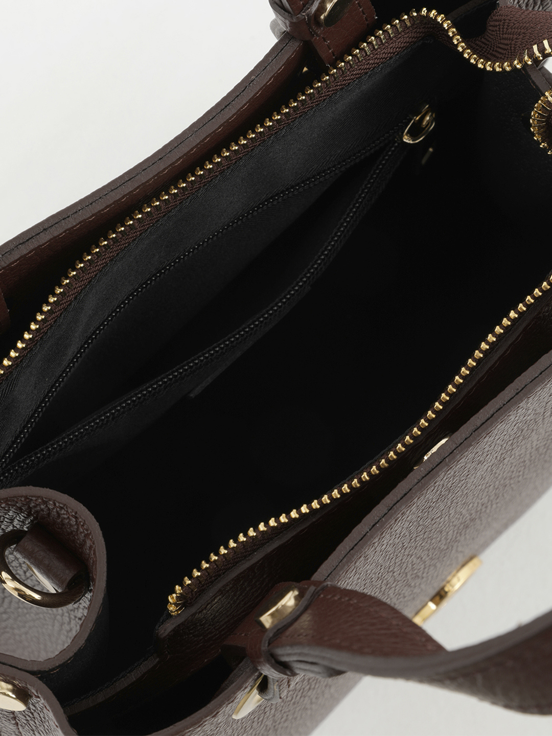 Внутри: три самостоятельных отдела. Центральный отдел закрывается на молнию, по бокам на магнитные кнопки. На задней стенке центрального отдела расположен карман на молнии, на противоположной стороне -  открытый кармашек для мобильного и мелочей.