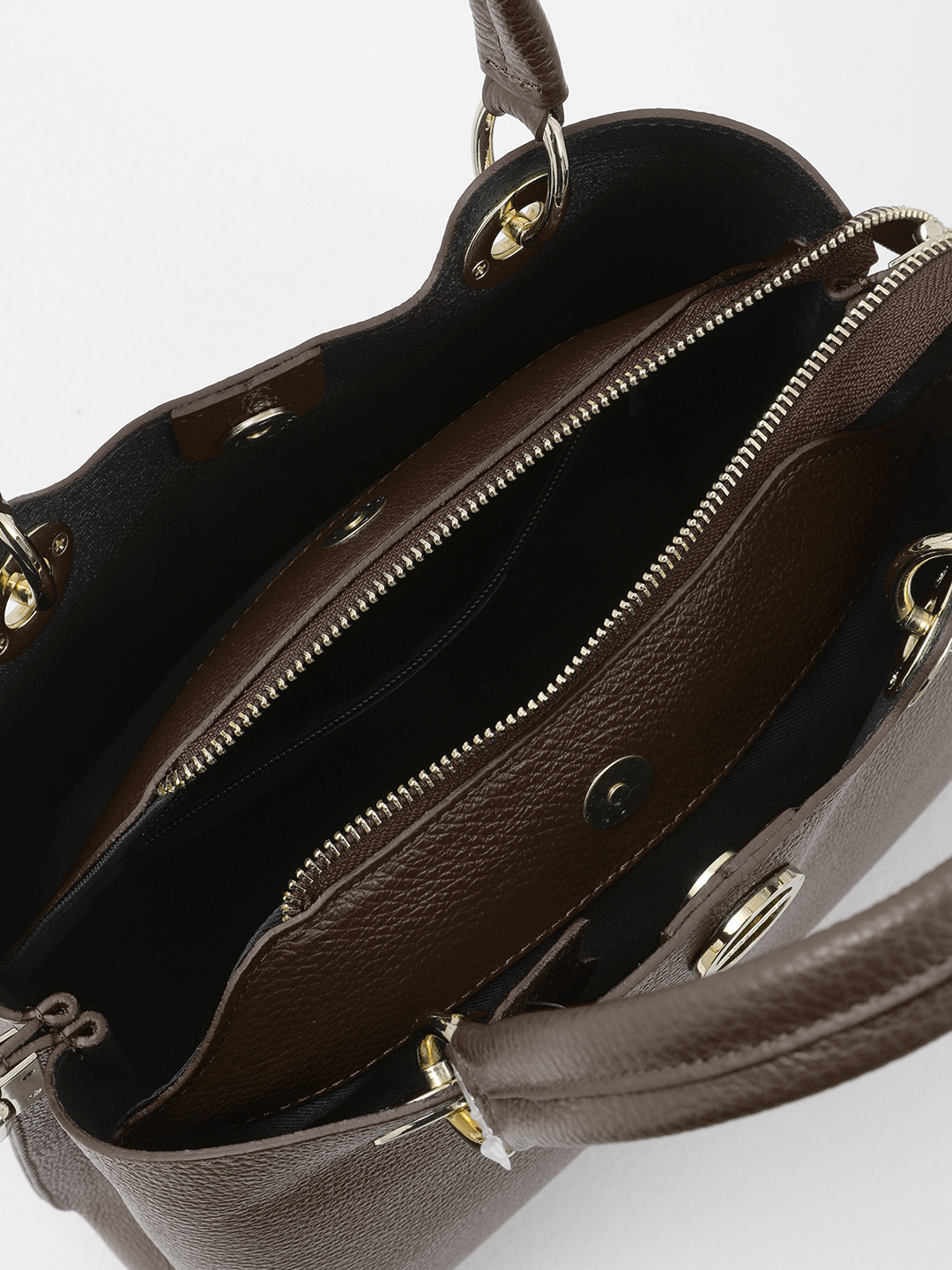Внутри: три самостоятельных отдела, центральный закрывается на молнию, боковые - на магнитные кнопки. На задней стенке центрального отдела расположен карман на молнии.