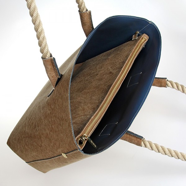 Внутри: два отдела без подкладки, разделённые съёмным карманом на молнии.