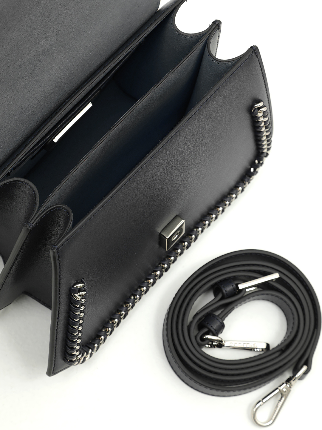 И ещё: сумочка без текстильной подкладки, закрывается перекидным клапаном на красивую фурнитуру, носится в руке. Отлично держит форму. Дополнительно прилагается длинный регулируемый кожаный ремешок на карабинах на плечо, максимальная длина - 127 см. Фурнитура - серебристый металл.