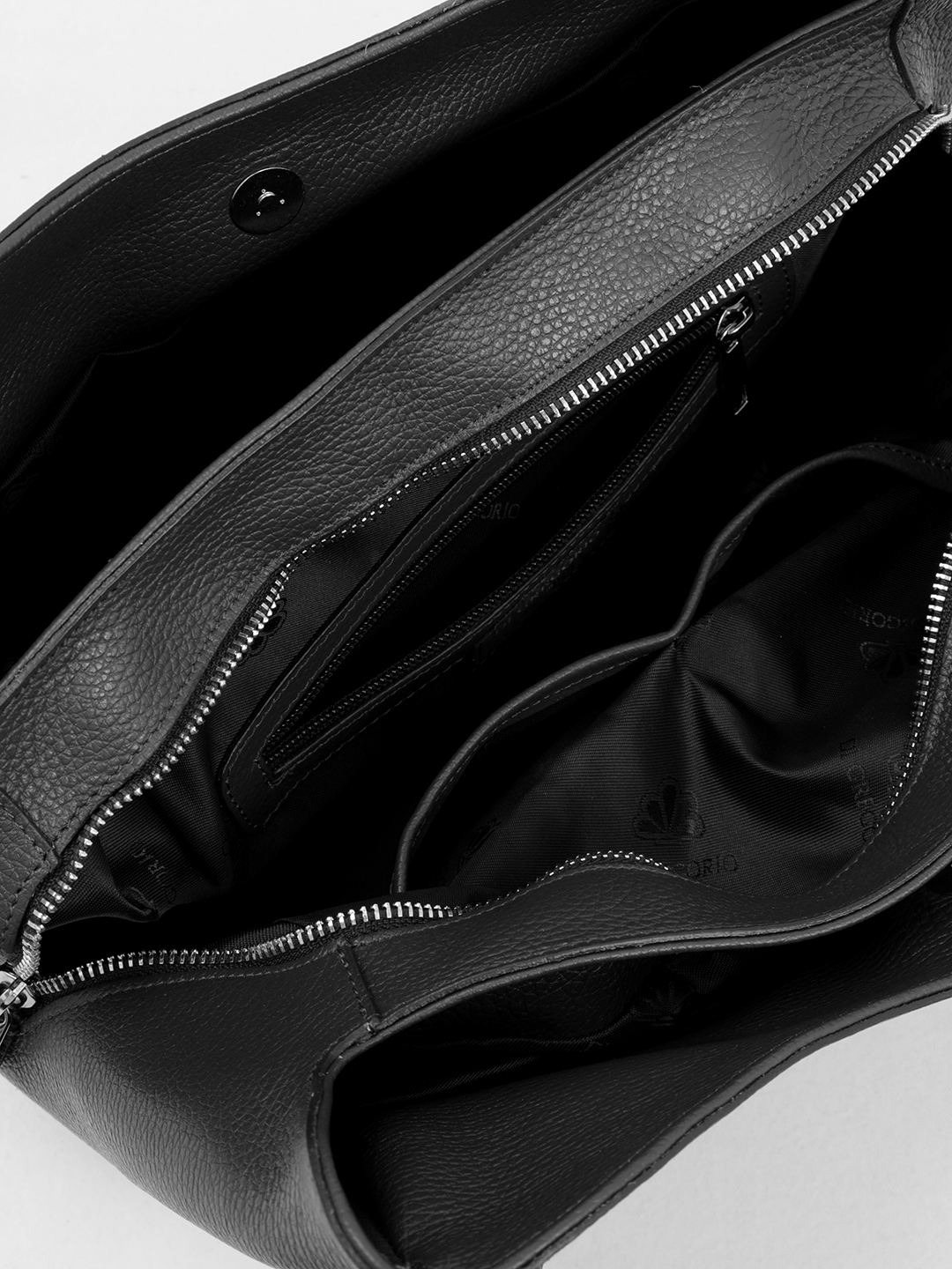 Внутри: три независимых отделения: центральное закрывается на молнию, боковые - на магнитные кнопки. Внутри центрального отдела - карман на молнии для документов, на противоположной стороне - два кармашка для мобильного и мелких предметов.