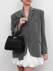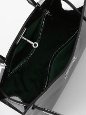 И ещё: сумочка закрывается на поворотную фурнитуру, носится на сгибе руки и в руке. Отлично держит форму.  Дополнительно прилагается длинный регулируемый кожаный ремешок на карабинах на или через плечо (максимальная длина - 122 см). Фурнитура - серебристый металл.