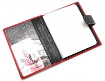 Внутри: 16 двойных прозрачных кармашков для пластиковых и визитных карточек. На левой створке два кармана и прозрачное окошко. На правой створке два кармана, прозрачное окошко и семь кармашков для пластиковых и визитных карточек.