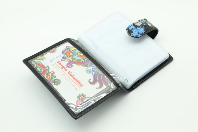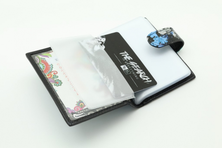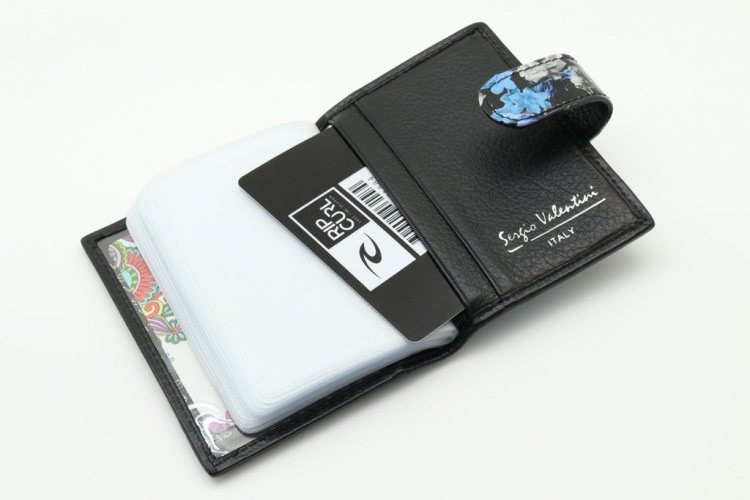 Внутри: 30 прозрачных кармашков для визитных и пластиковых карт, текстильная подкладка с логотипом, слева  - прозрачный захват, справа - кожаный захват c кармашком.