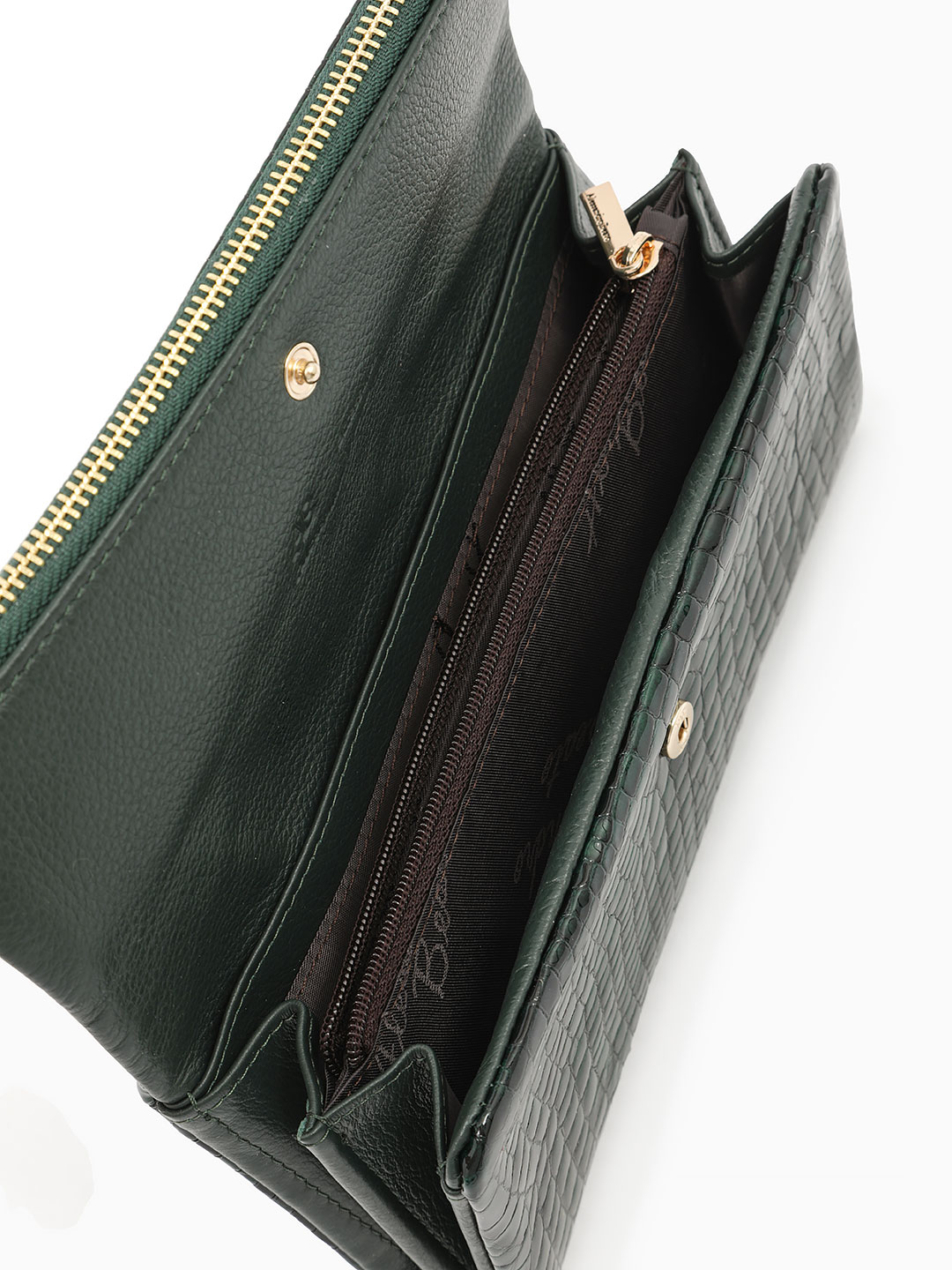 Внутри: 2 основных открытых отделения для купюр, отделение для мелочи на молнии, дополнительный карман для купюр, 6 кармашков для пластиковых и визитных карт и одно вместительное отделение на молнии.