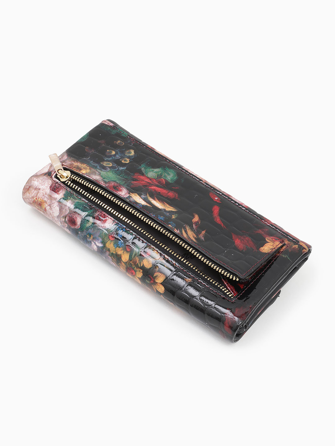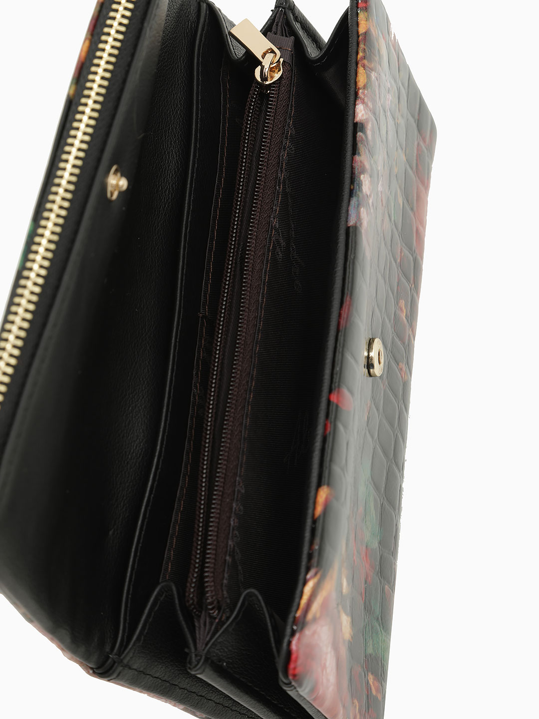 Внутри: 2 основных открытых отделения для купюр, отделение для мелочи на молнии, дополнительный карман для купюр, 6 кармашков для пластиковых и визитных карт и одно вместительное отделение на молнии.