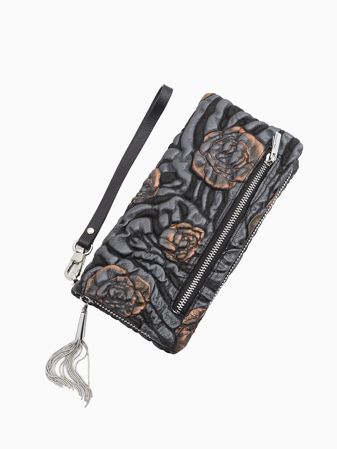 И ещё: закрывается на молнию. Дополнительно прилагается короткий кожаный ремешок на карабине на руку. Фурнитура - серебристый металл.