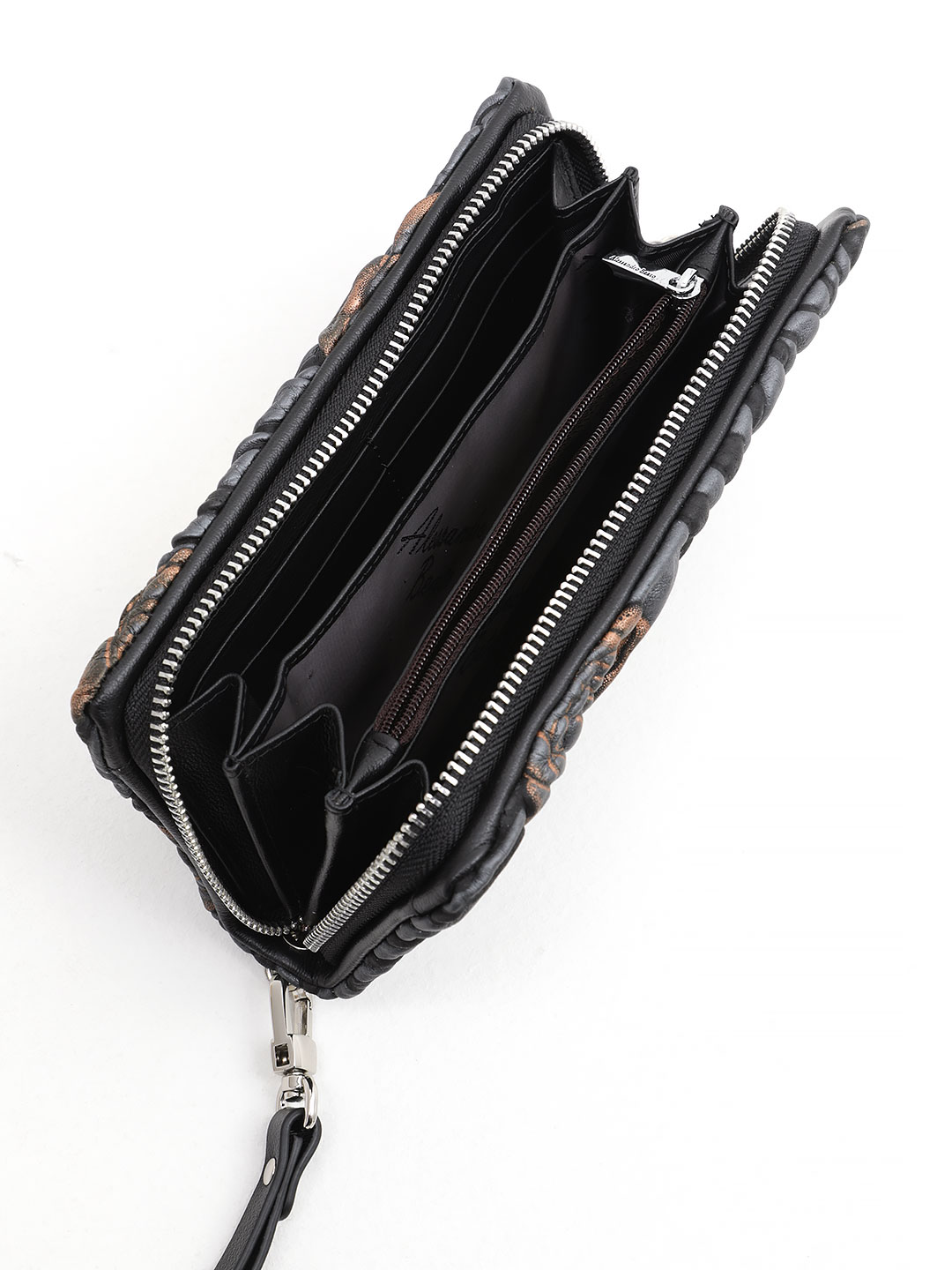 Внутри: 3 основных отделения для купюр, 2 дополнительных кармана для купюр, отделение для мелочи на молнии, 8 кармашков для пластиковых и визитных карт.