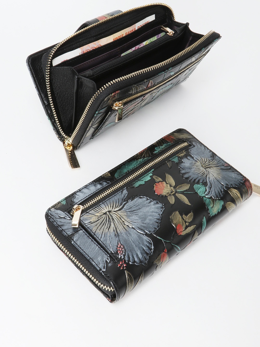 Внутри: 2 отделение для купюр, карман для мелочи на молнии, 18 кармашков для пластиковых и визитных карт, 5 потайных карманов, прозрачное окошко для проездного или фото.
